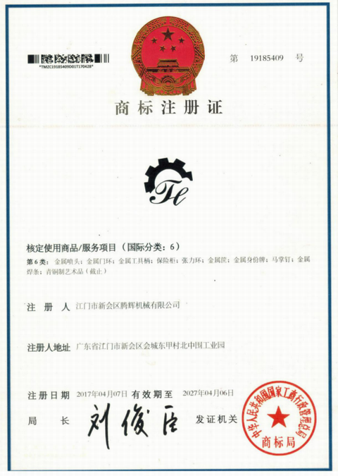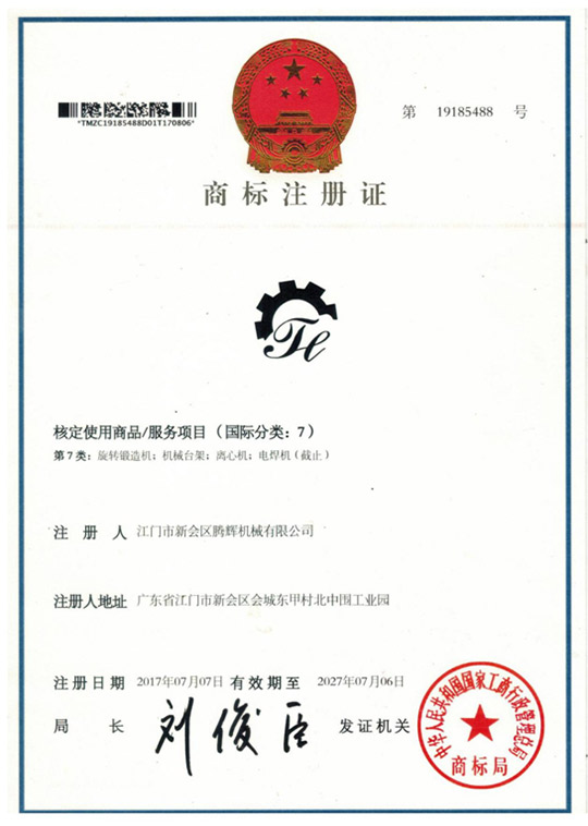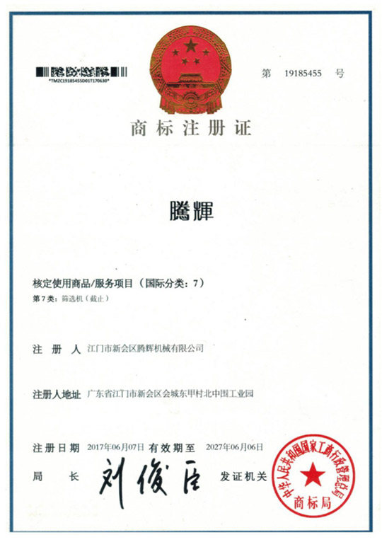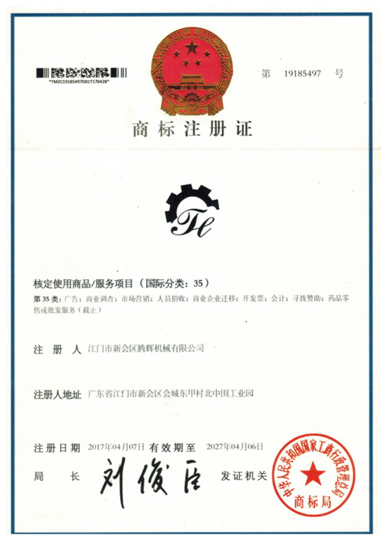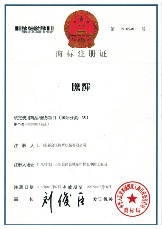 江門市新會區騰輝機械有限公司獲得國家商標局的認可圖形商標和文字商標穩固的品牌地位,樹立了良好的企業形象。