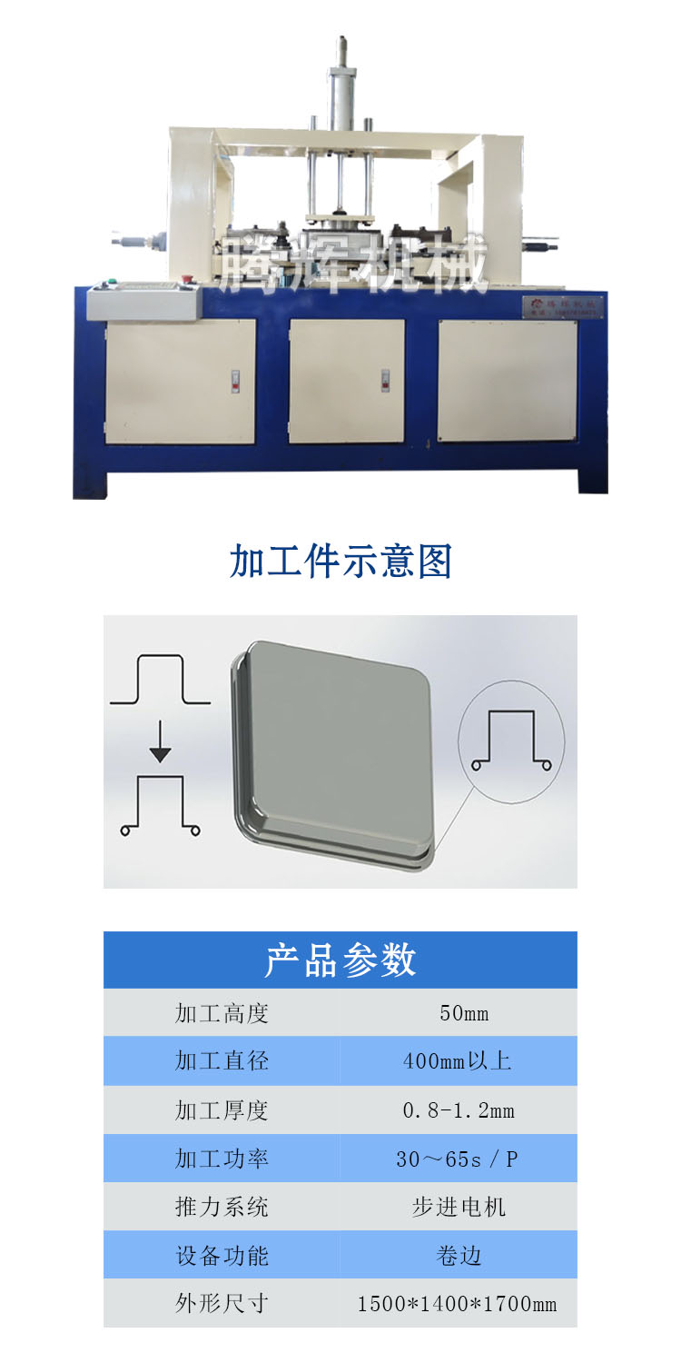 本文介紹的是用于長方形盤子產品加工設備異形卷邊機,首先將加工件放在模具上,按一鍵啟動后模具旋轉,卷邊工位進刀,跟隨模具旋轉施壓加工件的邊緣受壓向內卷邊。可任意選擇手動/自動操作,具有操作方便,性能穩定。(公司根據客戶需求,為客戶量身定制適合的設備,歡迎新老客戶咨詢了解)